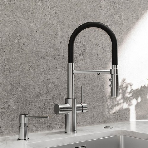 Удобный комбинированный смеситель два в одном с рычагом холодной и горячей воды справа, и рычагом для фильтрованной воды слева