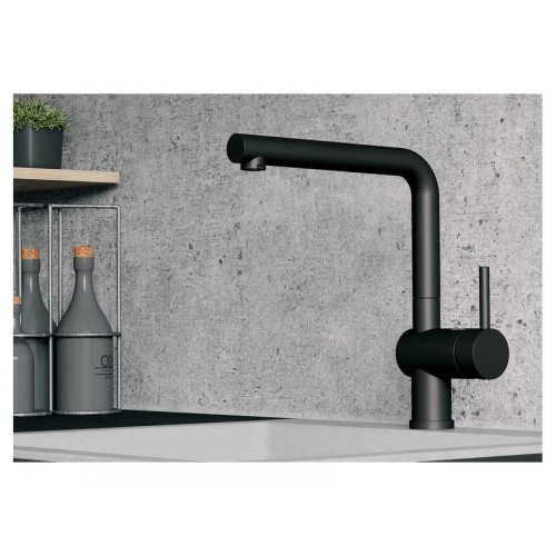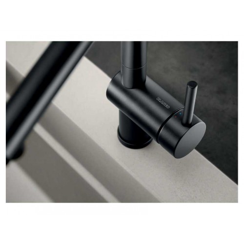 Особенно хорошо новый цвет сочетается с мойками в серых тонах или новом цвете бетон. Матовый черный цвет доступен для ограниченного ассортимента смесителей и аксессуаров.