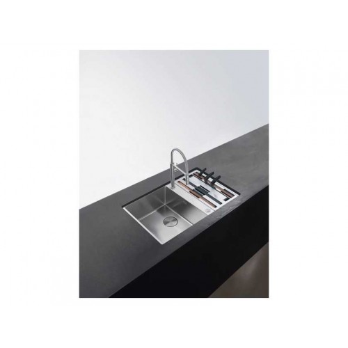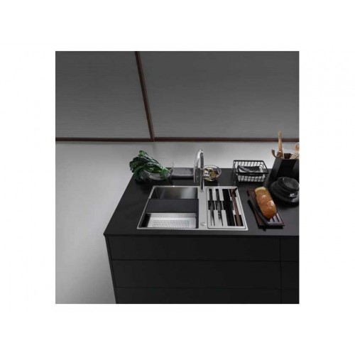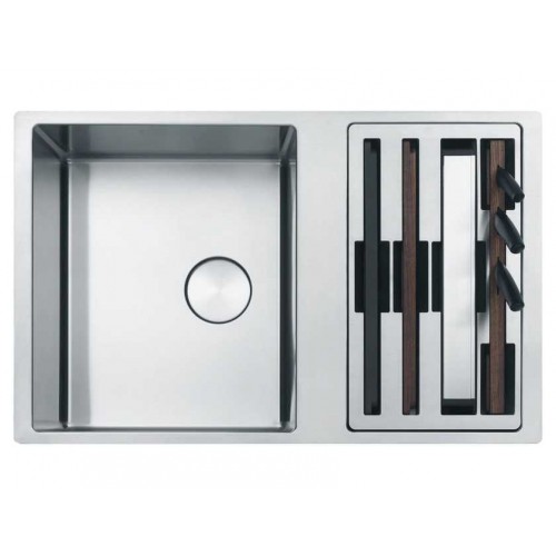 Многофункциональная кухонная раковина укомплектована: 2 разделочными досками (пластиковая и деревянная), миской из нержавеющей стали, тремя ножами (специально для хлеба, овощей, мяса/рыбы), деревянный держатель для ножей. Аксессуары размещаются на краях чаши или полностью закрывают ее, выполняя функцию крыла.