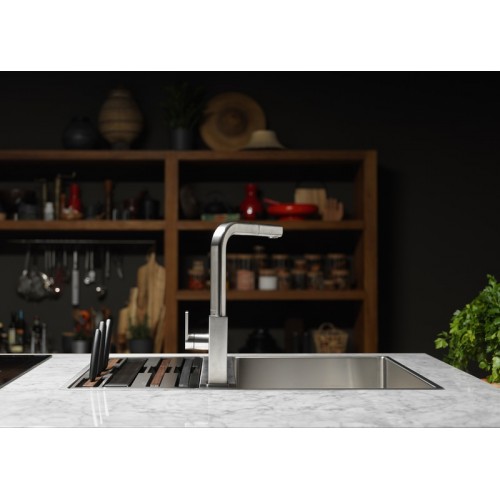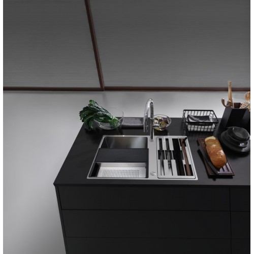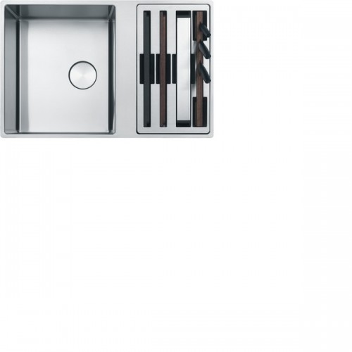 Многофункциональная кухонная раковина укомплектована: 2 разделочными досками (пластиковая и деревянная), миской из нержавеющей стали, тремя ножами (специально для хлеба, овощей, мяса/рыбы), деревянный держатель для ножей. Аксессуары размещаются на краях чаши или полностью закрывают ее, выполняя функцию крыла.