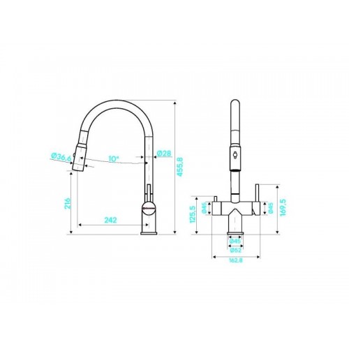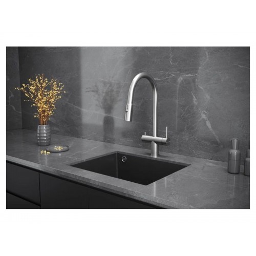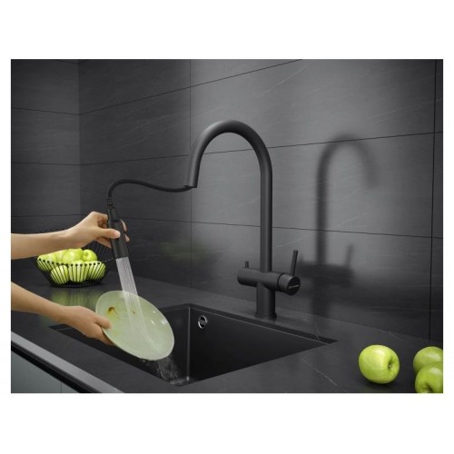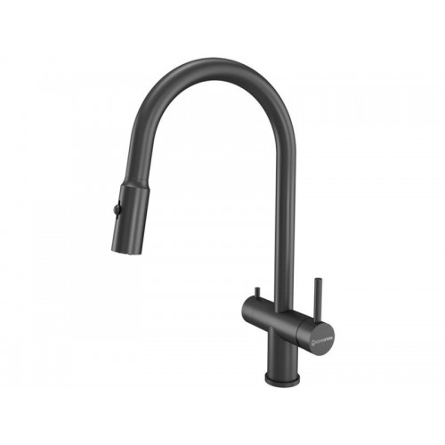 Смеситель KÜCHENSTERN BRUNN-FS объединяет сразу две функции - питьевая и обычная вода из одного смесителя. Смесителем удобно пользоваться , так как он имеет два отдельных рычага управления для водопроводной и фильтрованной воды, а также переключается на режим "Душ".