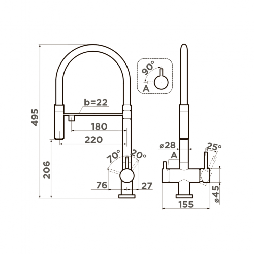 Можно укомплектовать гибким съемным шлангом в разных цветах