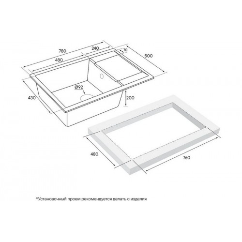 Размер мойки,мм:500 х 780 х 200