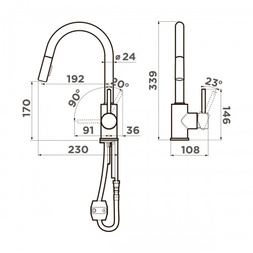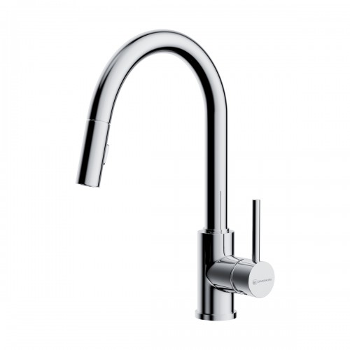 Практичный однорычажный смеситель выполнен в современном стиле и снабжен вытяжным шлангом;